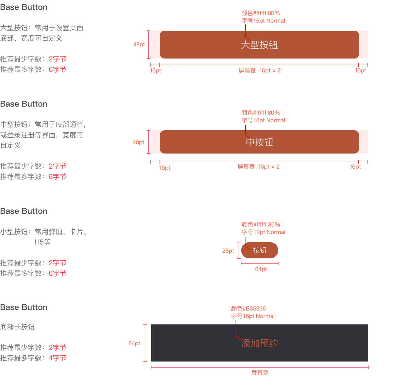 规范中按钮使用直角设计,提供四种为常用的尺寸大小参考,特殊情况下可按具体实际场景进行宽度定义。