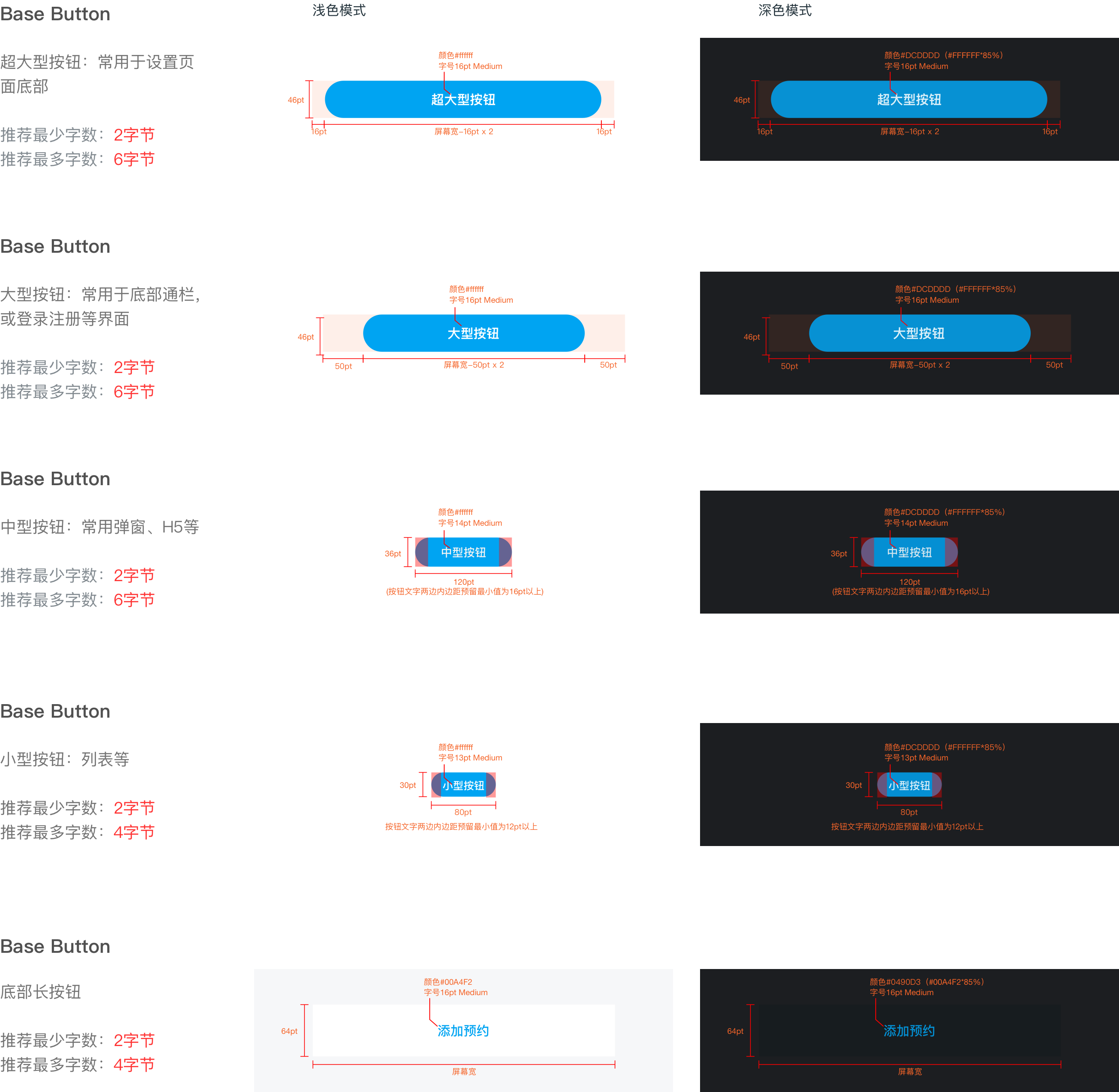 新版规范中按钮将使用圆角设计,提供四种为常用的尺寸大小参考,特殊情况下可按具体实际场景进行宽度定义。